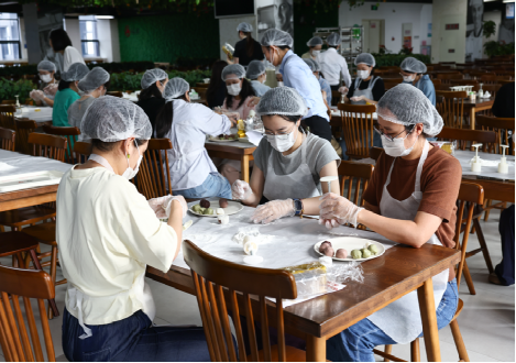 在掌握了基本要領(lǐng)后,員工們紛紛洗凈雙手,系上圍裙,興致勃勃地投入到月餅制作中。盡管很多人都是第一次嘗試,動(dòng)作略顯生疏——有的在揉皮時(shí)力度掌握不均,導(dǎo)致餅皮厚薄不一;有的在包餡時(shí)手法不夠熟練,餡料險(xiǎn)些“破皮而出”——但這些小插曲并未影響大家的熱情。在姚主席的巡回指導(dǎo)和同事間的互相幫助下,原本生澀的動(dòng)作逐漸變得流暢,現(xiàn)場(chǎng)充滿了歡聲笑語(yǔ)。